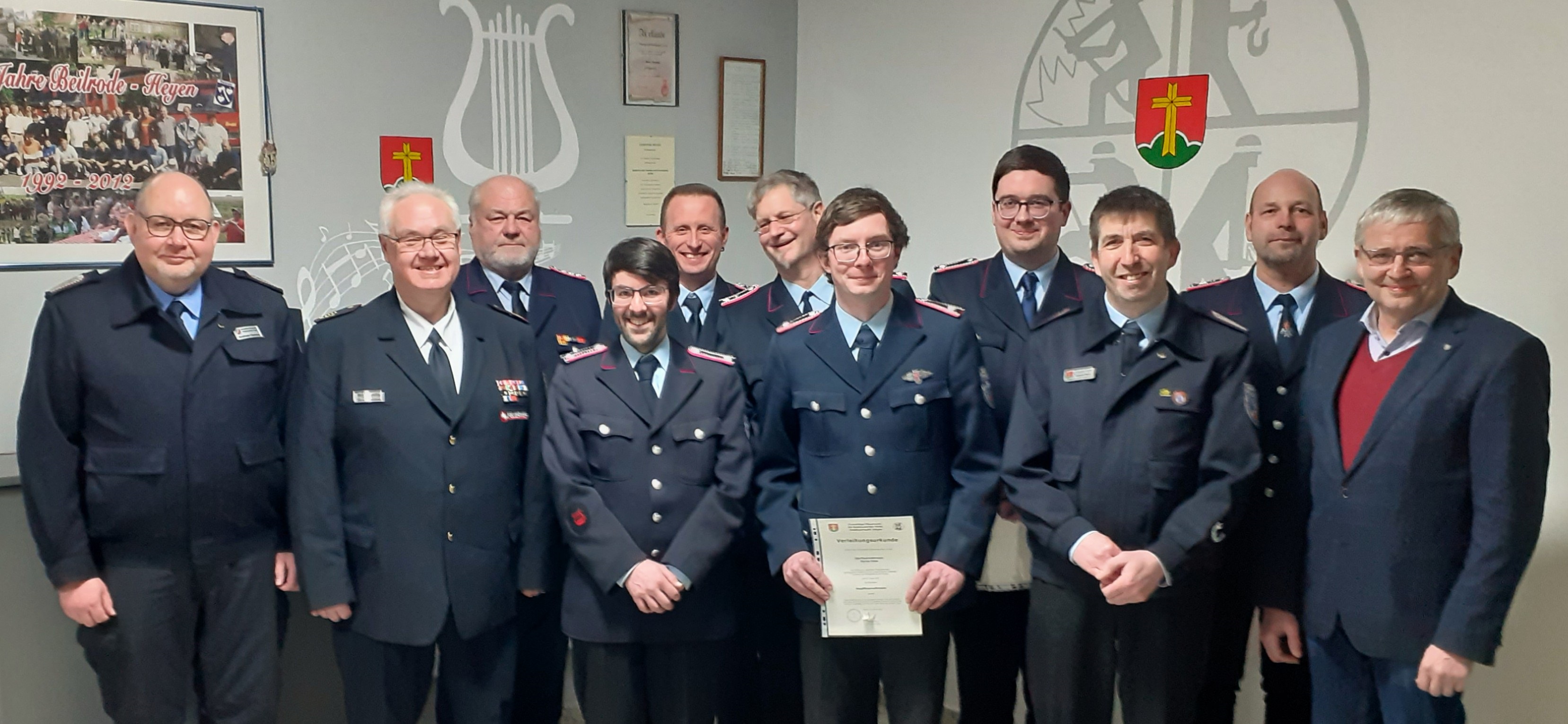 Für 50 Jahre Dienst im Musikzug erfuhr Rolf Keller eine Ehrung vom stellvertretenden Kreisbrandmeister Knocke, Lars Pfohl wurde für 25 Jahre Feuerwehrdienst ausgezeichnet. Wilhelm Baxmann (60 Jahre), Wilhelm Meyer (50 Jahre) und Gerd Fischer (40 Jahre) erhalten ihre Ehrung zu einem späteren Zeitpunkt. Mit der Bronze-Ehrennadel des Feuerwehrverbandes Niedersachsen überraschten Knocke und Gemeindebrandmeister Damrau Heyens Wehrchef Dietrich Meyer. Er erhält diese nicht alltägliche Auszeichnung in Anerkennung seines besonderen Einsatzes für die Feuerwehr.