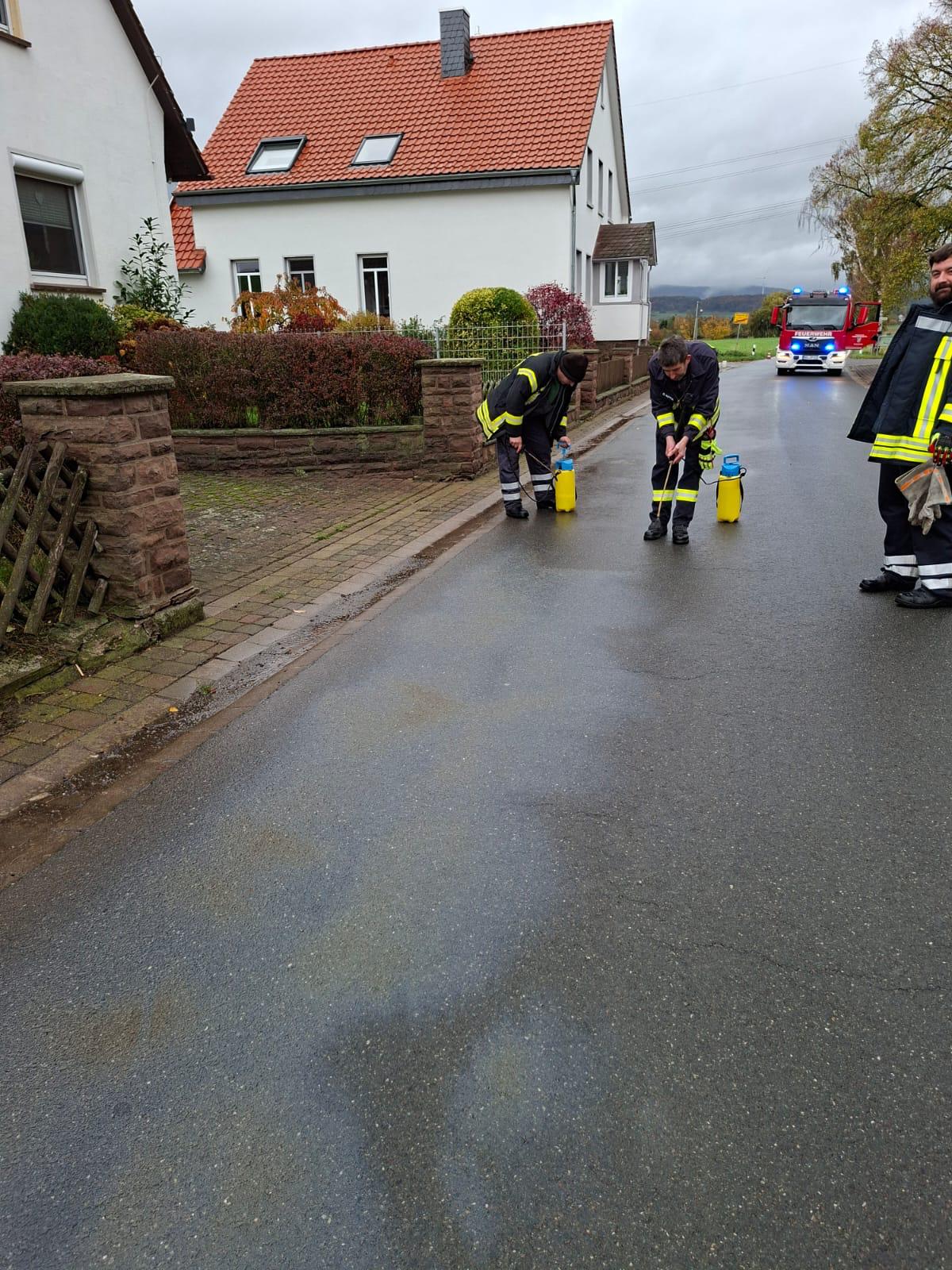 Die Ölspur wurde aufgrund der nassen Witterung mit ÖFix FMO Straße (einem flüssigen Biotensid Ölfilmentferner) beseitigt.