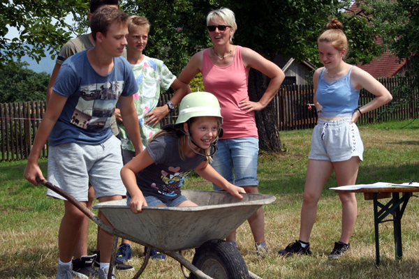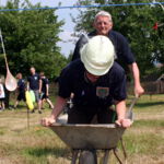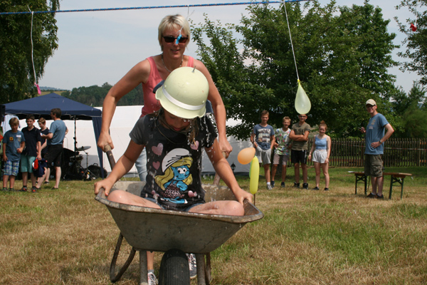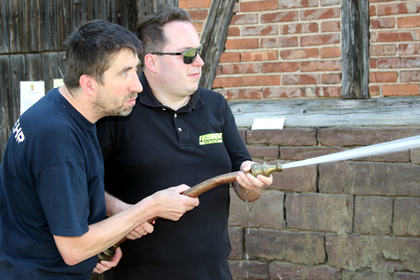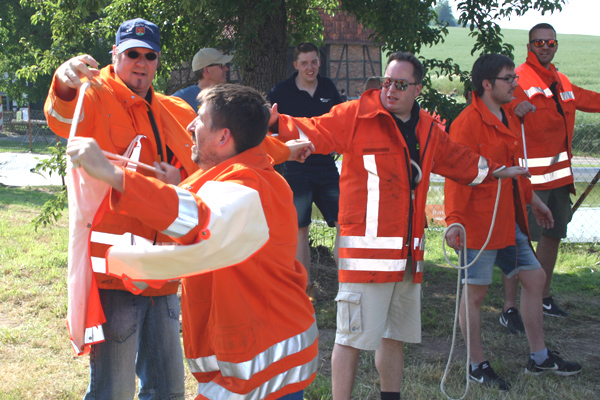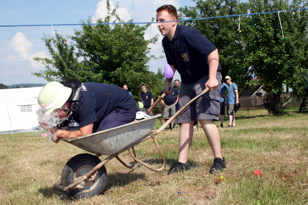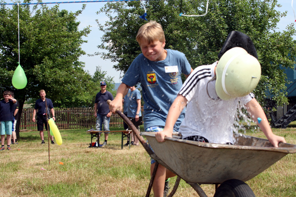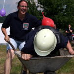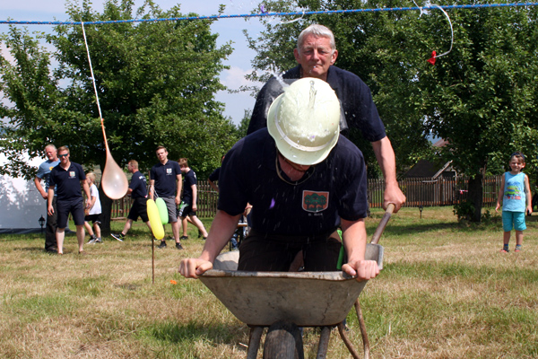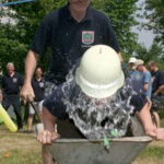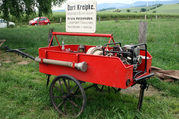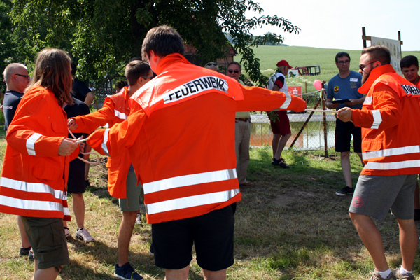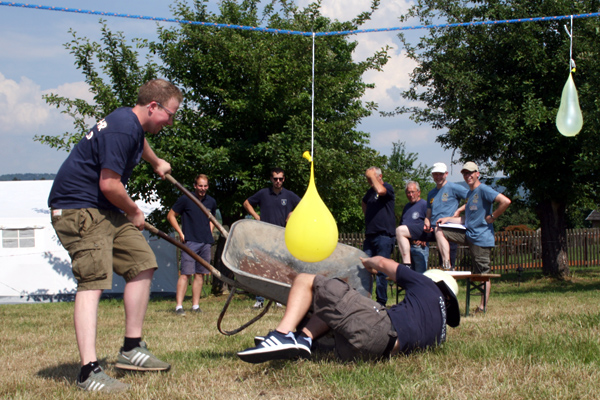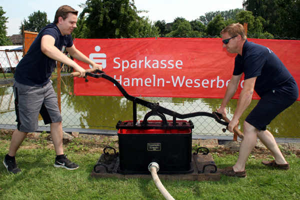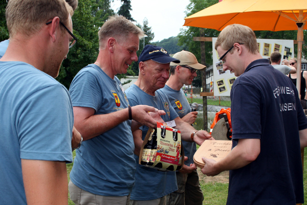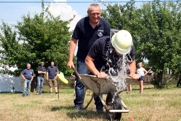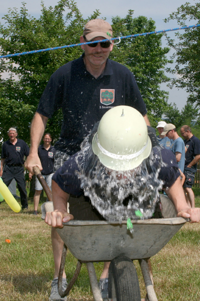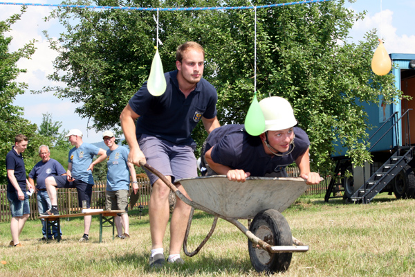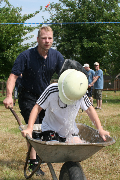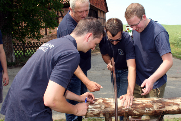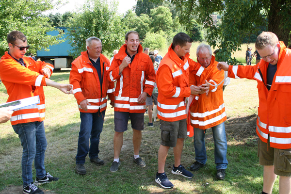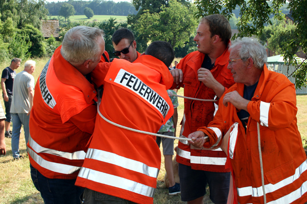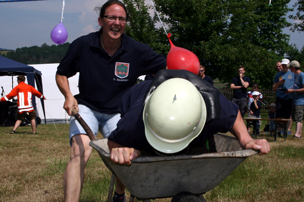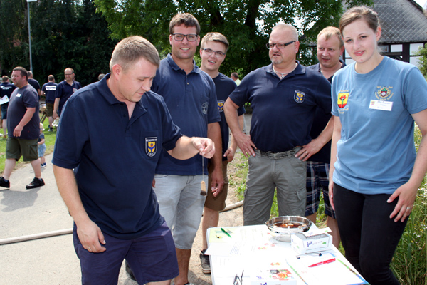 Es galt, als Schubkarren-Passagier mit Wasser gefüllte Luftballons mit „Pickelhaube“ zu treffen, nasse Teebeutel möglichst weit zu schleudern, sich Gegenstände zu merken oder zu zweit im großen Plastiksack zu hüpfen. Anlass für den Parcours rund um den Löschteich war das 140-jährige Gründungsfest der Freiwilligen Feuerwehr Kreipke. Auch wenn seit einigen Jahren die Nachbarwehren den Brandschutz sicherstellen, hält man das teilweise antiquarische Gerät in Ehren. So kam der Handdrucksspritze von 1878 beim Spiel „Feuerspritze“ herausragende Bedeutung zu. Für die Akteure beschwerlich, das Publikum aber sehr amüsant war die Station „Auffädeln“, bei sich alle sechs Teammitglieder mittels Leine, die durch die Ärmel der Einsatzjacken gezogen wurde, so schnell wie möglich „auffädeln“ mussten. Am Sägebock war ein exakt ein Kilogramm schweres Stück Stammholz abzuschätzen und absägen. Das erledigtegrammgenau das Team II aus Bremke.