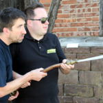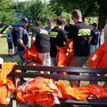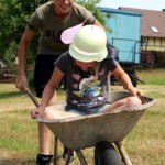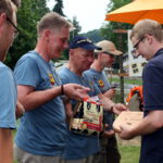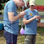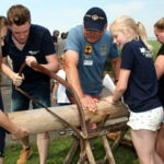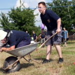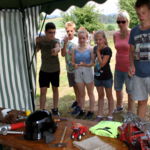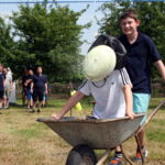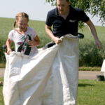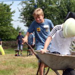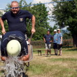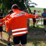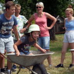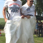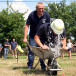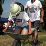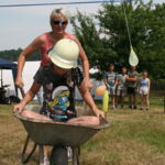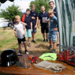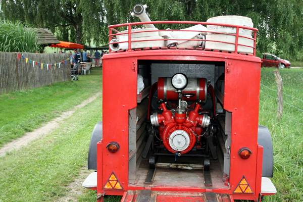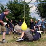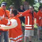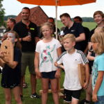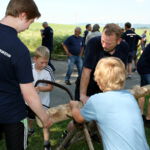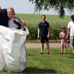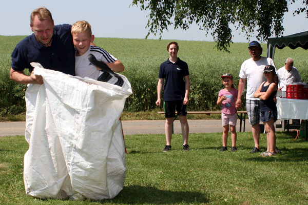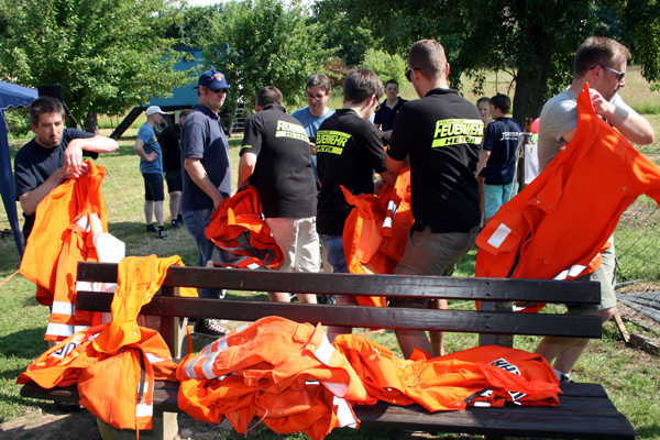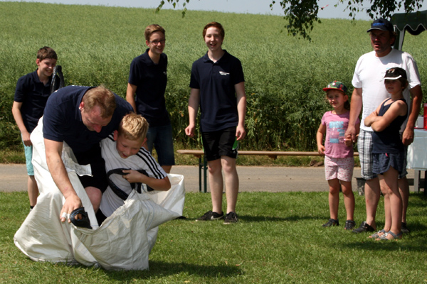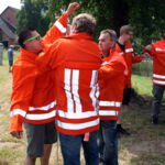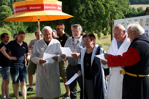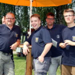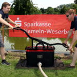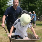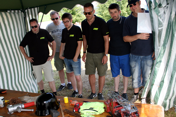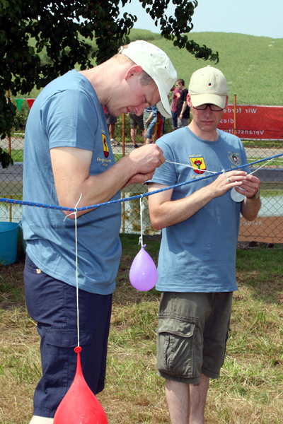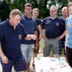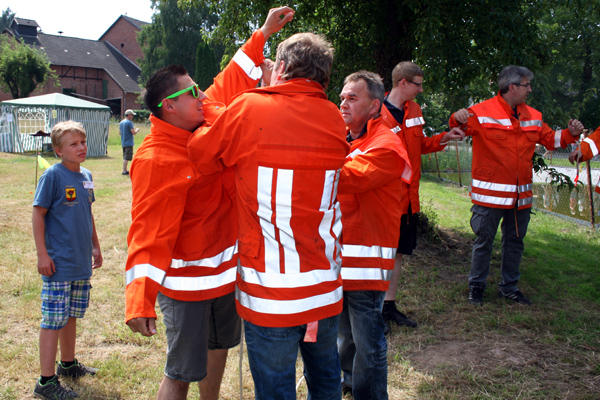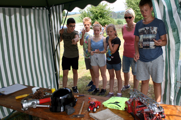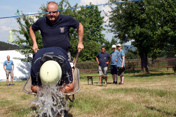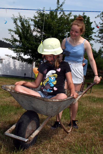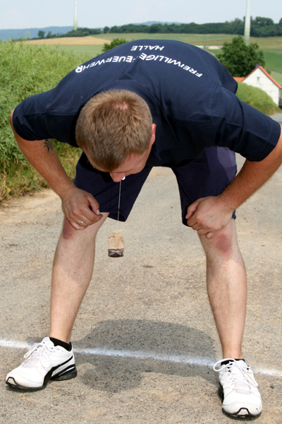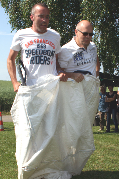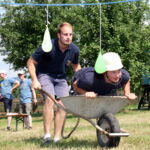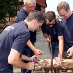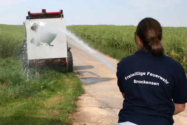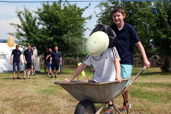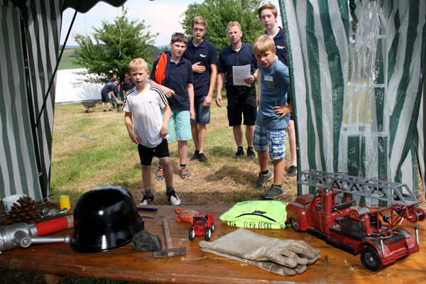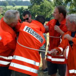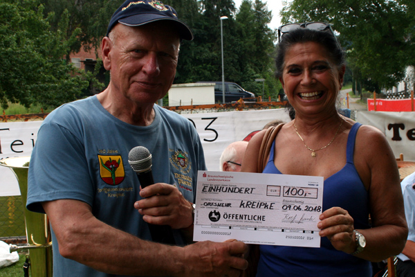 Es galt, als Schubkarren-Passagier mit Wasser gefüllte Luftballons mit „Pickelhaube“ zu treffen, nasse Teebeutel möglichst weit zu schleudern, sich Gegenstände zu merken oder zu zweit im großen Plastiksack zu hüpfen. Anlass für den Parcours rund um den Löschteich war das 140-jährige Gründungsfest der Freiwilligen Feuerwehr Kreipke. Auch wenn seit einigen Jahren die Nachbarwehren den Brandschutz sicherstellen, hält man das teilweise antiquarische Gerät in Ehren. So kam der Handdrucksspritze von 1878 beim Spiel „Feuerspritze“ herausragende Bedeutung zu. Für die Akteure beschwerlich, das Publikum aber sehr amüsant war die Station „Auffädeln“, bei sich alle sechs Teammitglieder mittels Leine, die durch die Ärmel der Einsatzjacken gezogen wurde, so schnell wie möglich „auffädeln“ mussten. Am Sägebock war ein exakt ein Kilogramm schweres Stück Stammholz abzuschätzen und absägen. Das erledigtegrammgenau das Team II aus Bremke.