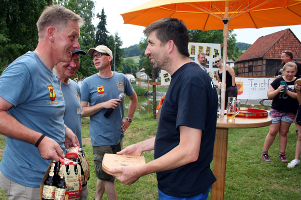 Drittplatzierter des Wettbewerbs wurde die Feuerwehr Dohnsen, Rang vier ging an die „Butzekatzen“ (FFW Heyen III) vor dem „Roten Hahn“ (FFW Brockensen), gefolgt von den „Tollkühnen“ (FFW Bremke II), dem Team „Raucherbein“ (FFW Tuchtfeld), dem „1. FC Schlüpperhausen“ (FFW Bremke I), den „Funny Rainbows“ (FFW Heyen I) und „The Blueman Group“ (FFW Heyen II). Auftritte der Feuerwehrkapelle Heyen, des „Saunachores Emmerthal” und von Lars Pfohl mit Ukulele sorgten beim Teichfest für gute Unterhaltung. Anziehungspunkt war auch die kleine Chronik an Stellwänden, die Erinnerungen an frühere Teichfeste wachrief. Unter Bäumen und Sonnenschirmen ging es bis in die Nacht gemütlich zu. Mit einem großen Kuchenbuffet, einer Vielzahl an Salaten, Gegrilltem und kühlen Getränken erwiesen sich die Kreipker auch in punkto Verpflegung als perfekte Gastgeber. Toll, was die zahlenmäßig kleine Dorfgemeinschaft Großes auf die Beine gestellt hat. Und auch in Kreipke ist man zufrieden. Als Sprecher der Dorfgemeinschaft kommentiert Uwe Hölscher: „Eine gelungene Veranstaltung, Glück beim Wetter, super Mannschaften und fröhliche Besucher. Unsere Einwohnerzahl von 31 hat sich quasi für einen Tag zeitweise verfünffacht“, so sein augenzwinkerndes Fazit.